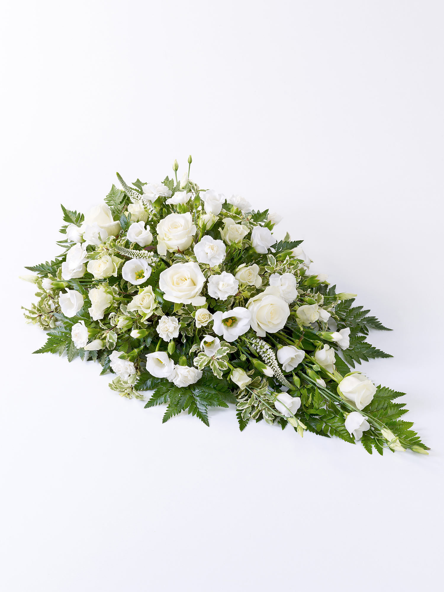 A beautiful tribute for a baby, this pretty spray features large-headed roses, spray carnations and spray roses, interspersed with Veronica and lisianthus. It is finished with leather leaf and pittosporum.