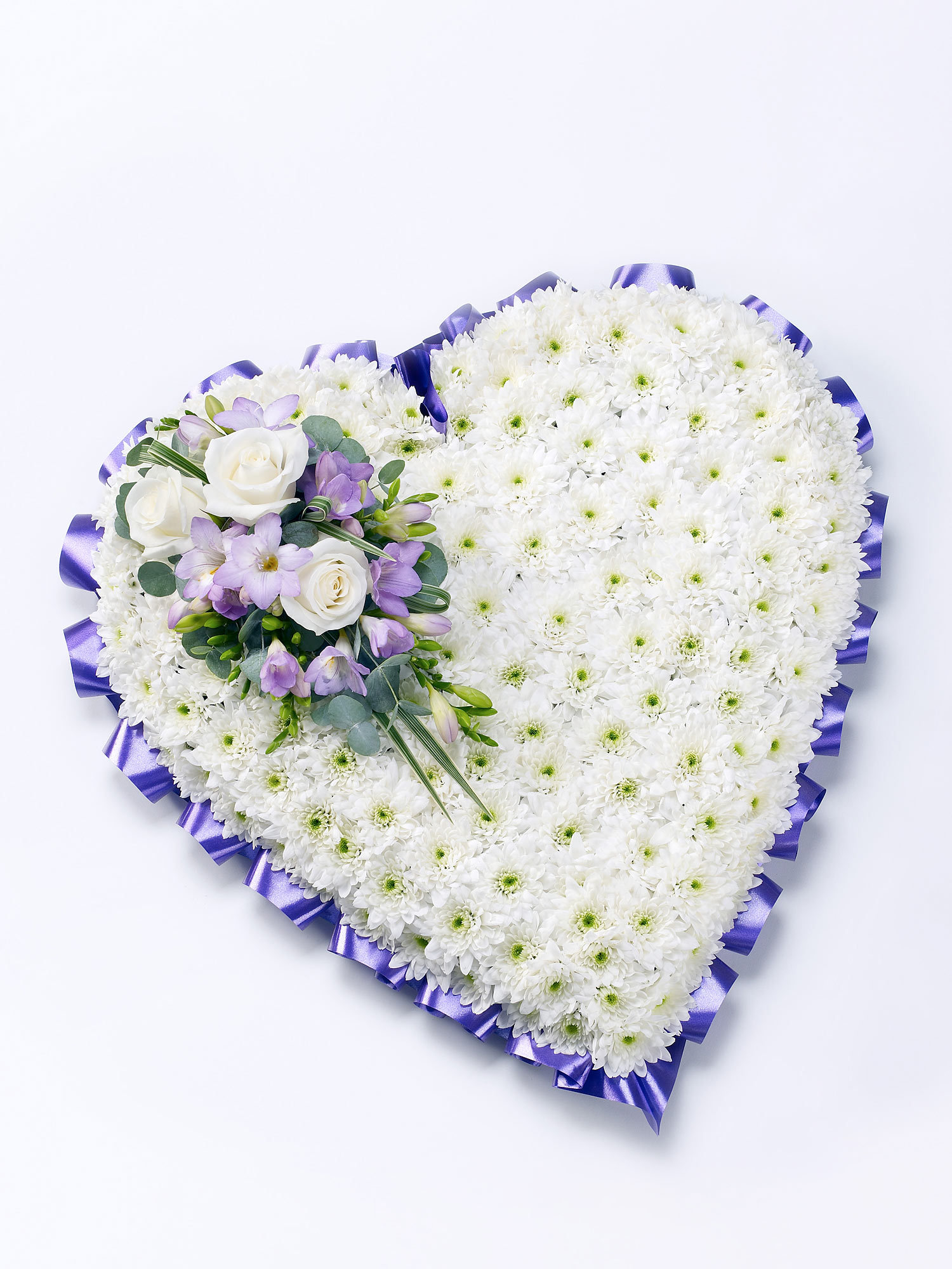 A classic heart-shaped design covered with a mass of double spray chysanthemums and finished with a spray of large-headed roses, eryngium and ruscus.