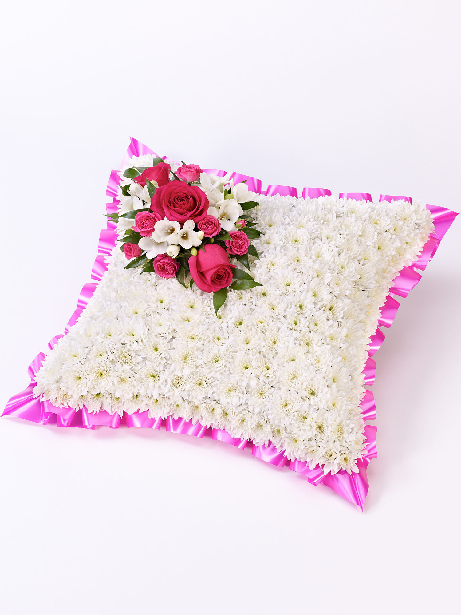 A classic cushion-shaped design created using a mass of white double spray chrysanthemums and finished with a spray of cerise roses and white freesias and a pink ribbon trim.