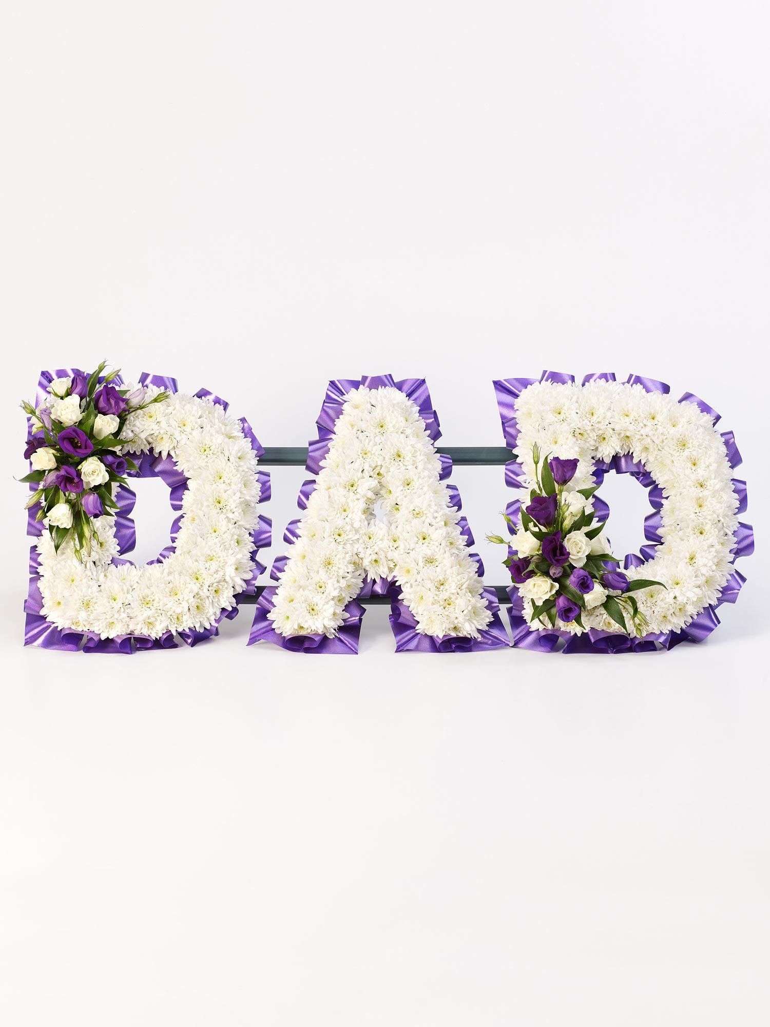A mass of white double spray chrysanthemums is finished with delicate sprays of roses and lisianthus in white and purple to create this Dad tribute.
