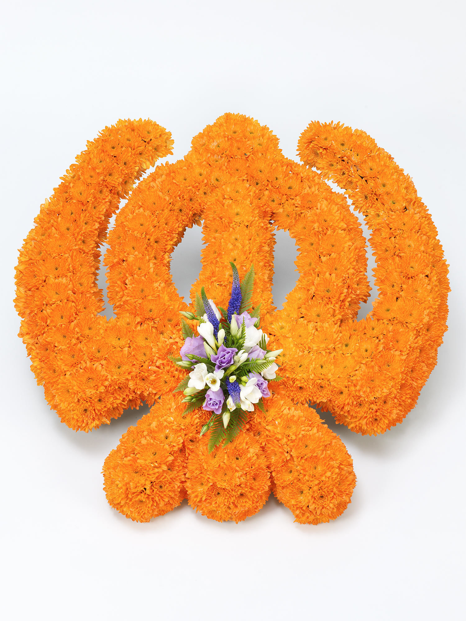 A mass of orange double spray chrysanthemums forms the Khanda tribute which is finished with a spray of white freesias, lilac lisianthus and blue veronica.