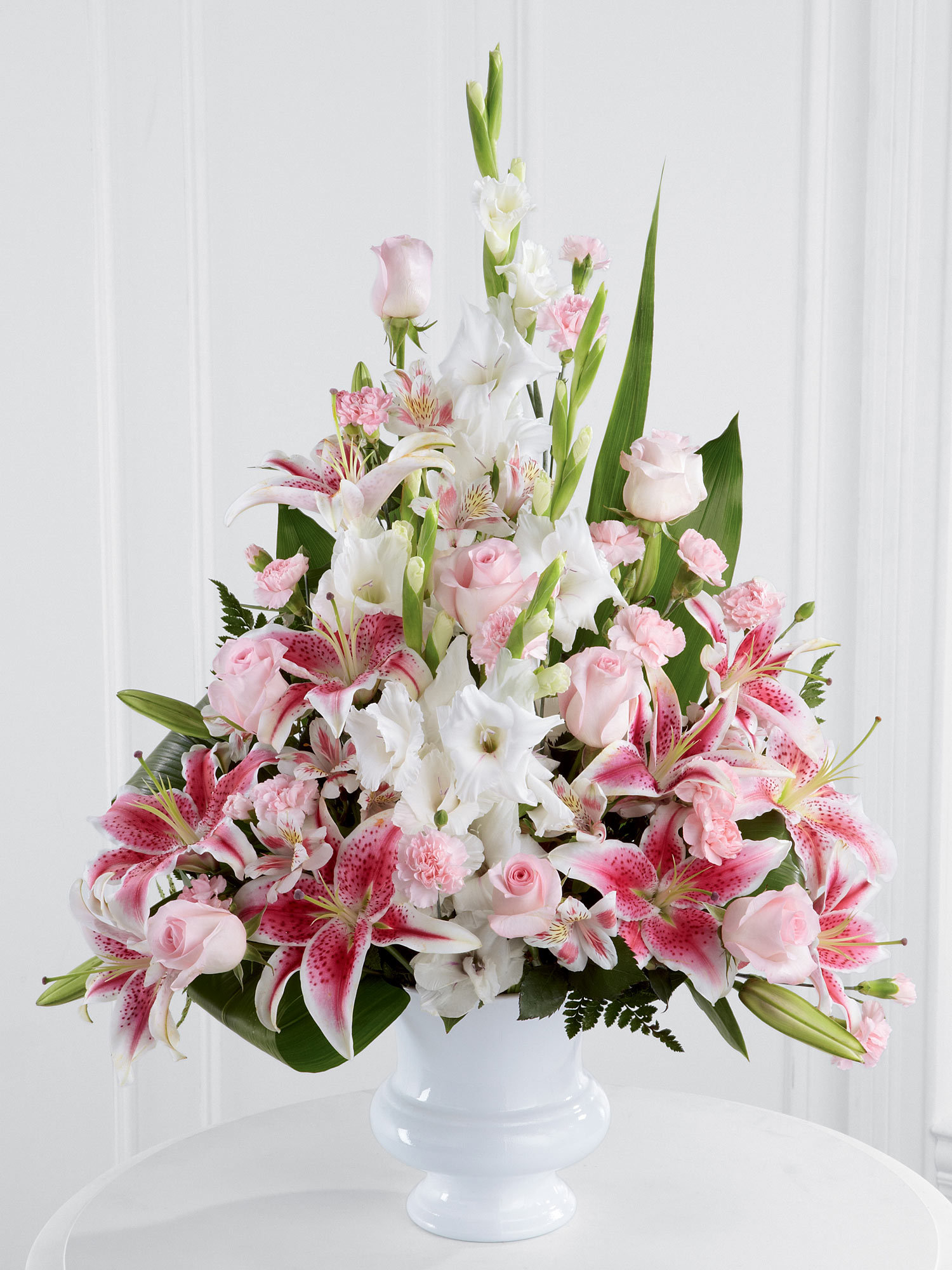 The beautiful arrangement is an exquisite display of serene wishes and grace. Soft pink roses, alstroemeria and carnations are arranged amongst pink Oriental lilies and white gladioli, along with lush greens in a white plastic urn.