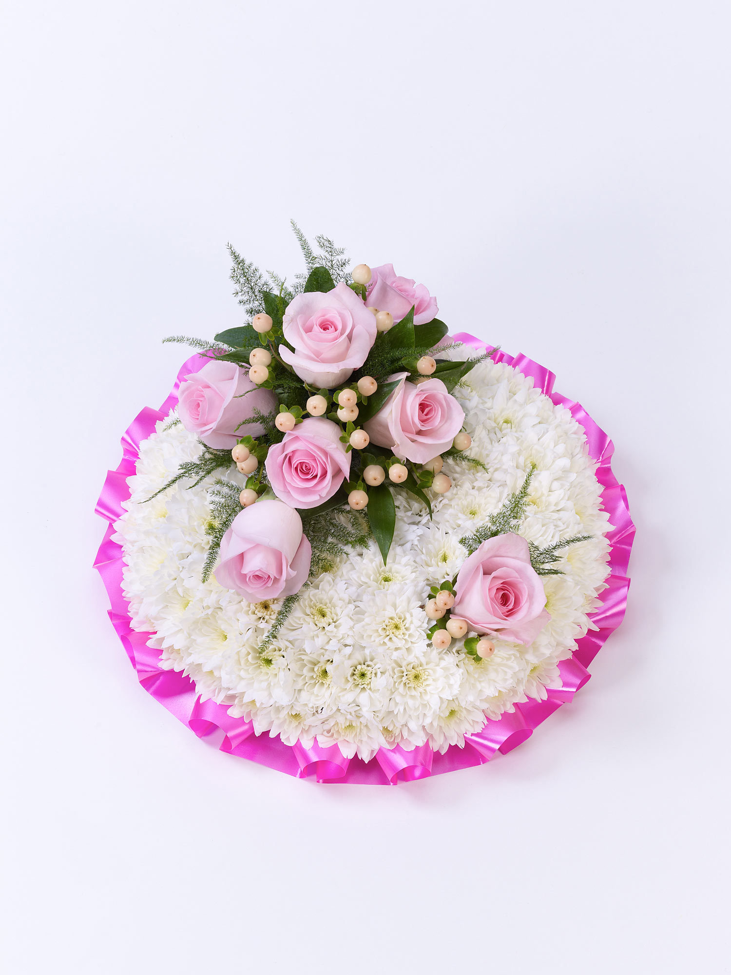 A classic posy design created using a mass of white double spray chrysanthemums and completed with a spray of roses, French ruscus and hypericum berries.