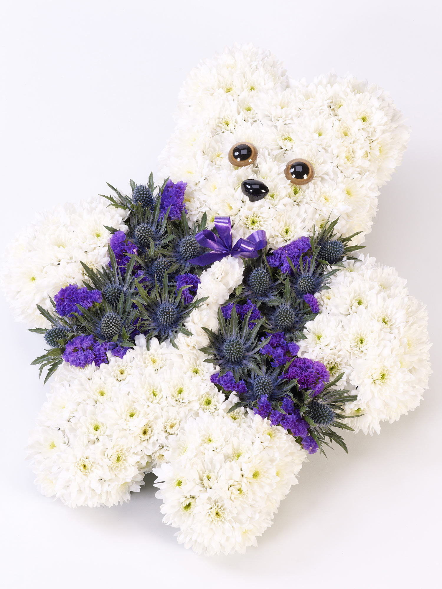 Double spray chrysanthemums, spray carnations, eryngium and statice are used to create this blue and white design shaped like a teddy bear.