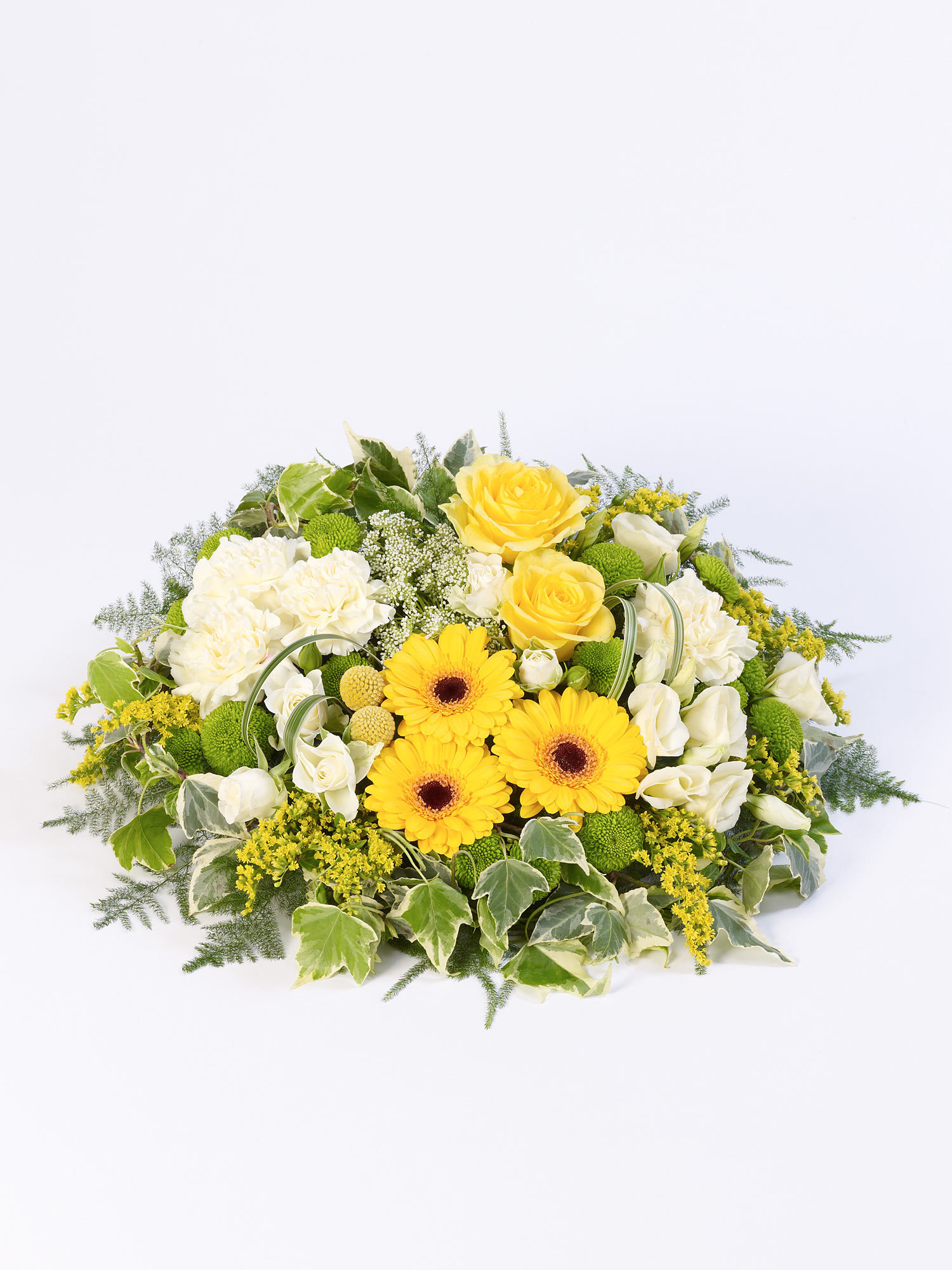 Large-headed roses, carnations, spray chrysanthemums and germini are surrounded by ivy , solidago and asparagus fern to create this white, yellow and green woodland-themed posy design.